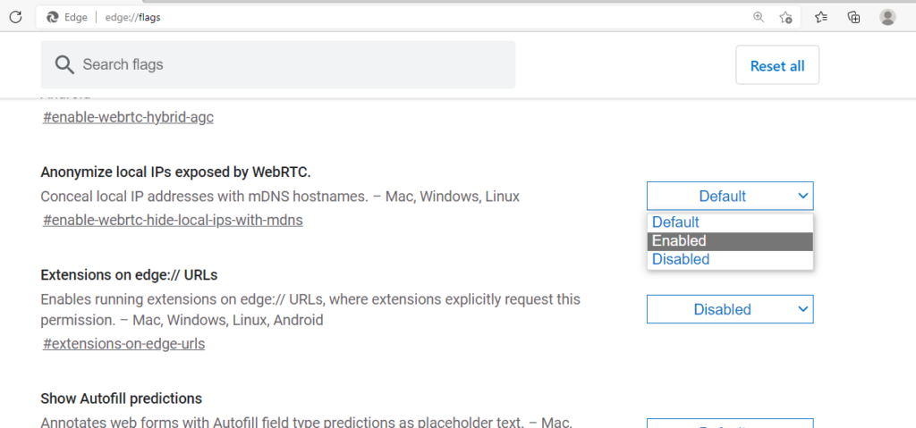 当您键入时,将出现开发人员设置列表'关于标志'在地址栏中。现在,向下滚动找到设置'对 WebRTC 公开的本地 IP 进行匿名化。' 默认情况下,您会发现此功能设置为 '默认.'要更改此设置,请单击“默认' 在那个按钮中。