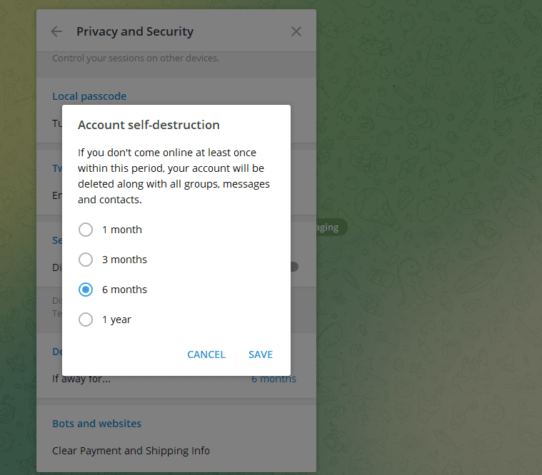 Telegram 有一个被称为“自毁”的安全功能,其中您的帐户在一段时间不活动后将被删除。