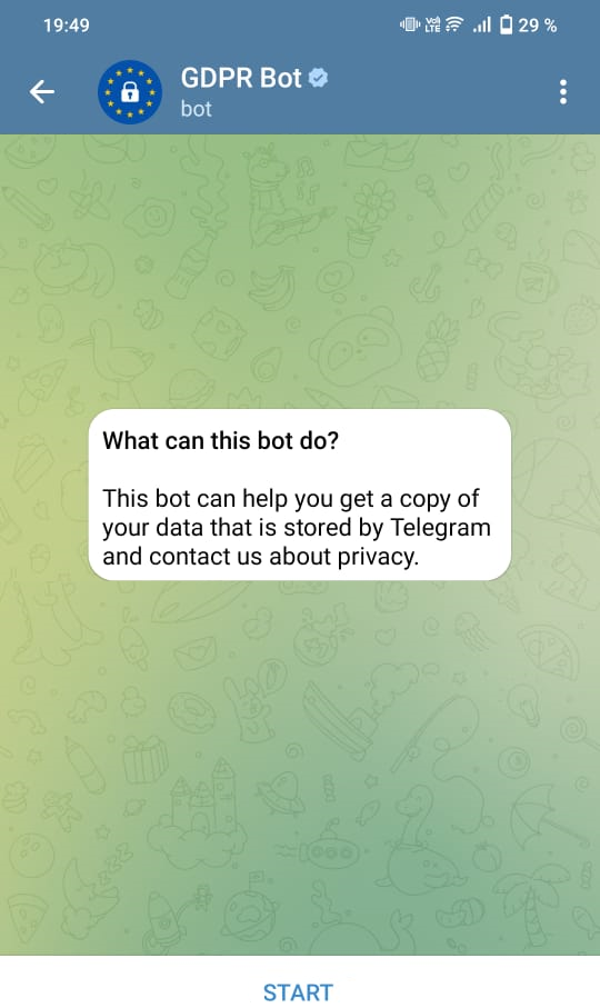 执行此操作后,将打开一个聊天窗口,然后显示“/开始” 自动发送命令和欢迎文本。您将在该文本中找到需要输入的内容以请求您的数据或联系当局。
