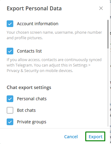 之后,单击“设置,“ 然后 ”先进的,”并向下滚动到“导出电报数据”选项。设置您想要提取的数据并点击“出口”。