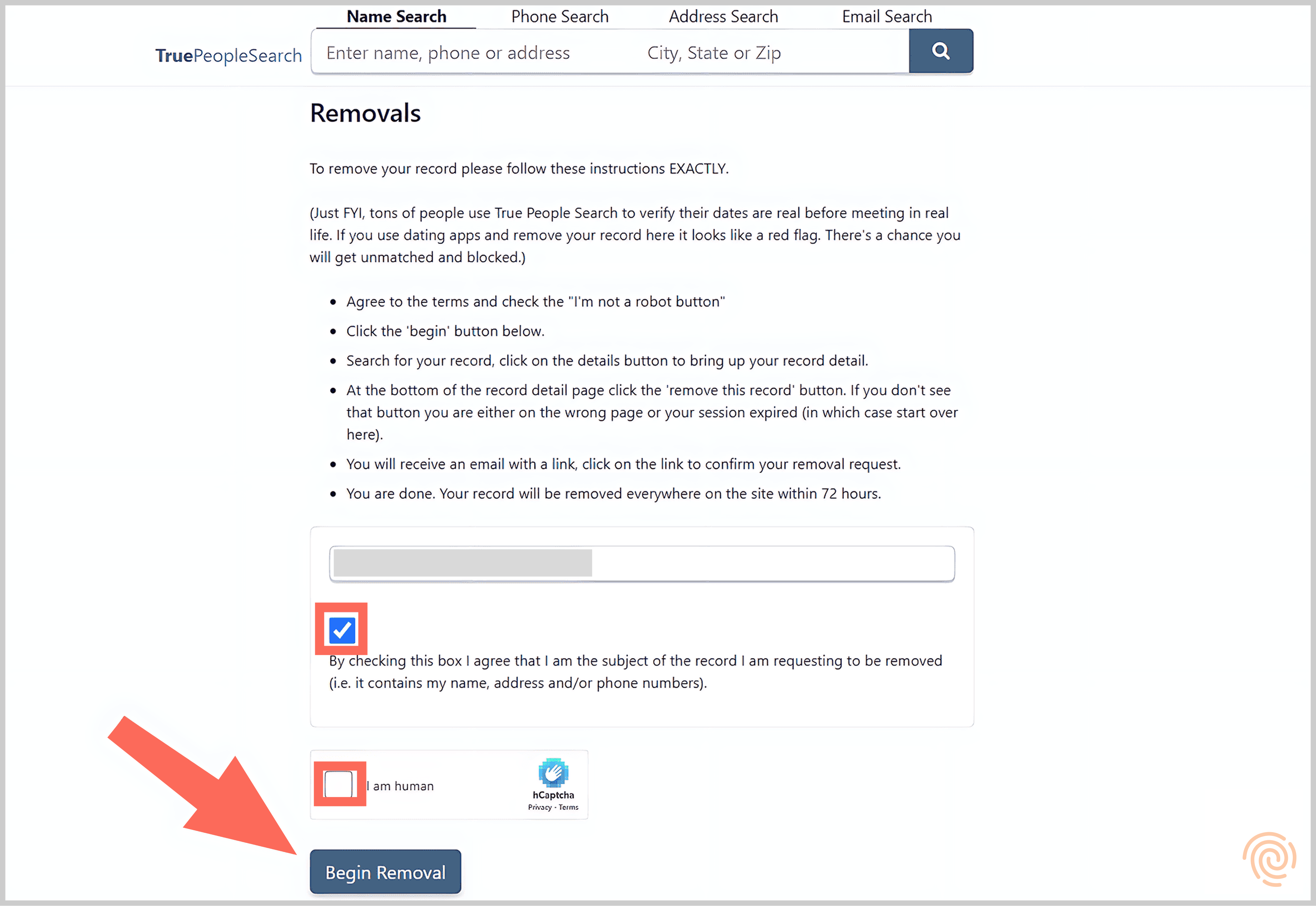 提交删除请求后,TruePeopleSearch.com 将向步骤 2 中提供的地址发送一封确认电子邮件。