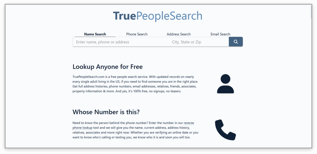 TruePeopleSearch 是一个免费的在线人物搜索平台。它收集并发布用户的个人数据,包括姓名、地址、电话号码等。提供免费访问公民个人记录的机会——只要搜索名字,你就会得到关于那个人的一切。