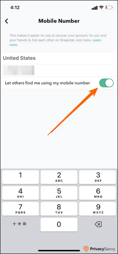- 在您的手机号码下方,取消选中该框上面写着“让其他人使用我的手机号码找到我”。