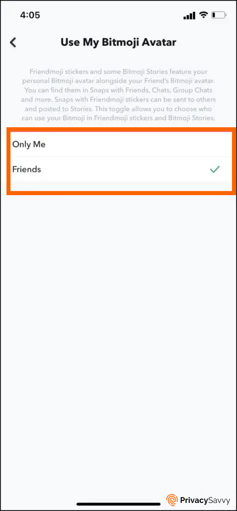 用于控制 Bitmoji 访问的 Snapchat 隐私设置