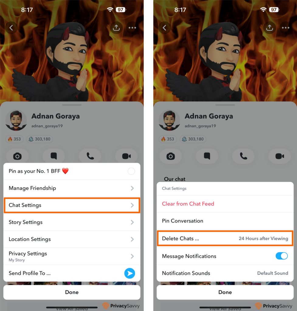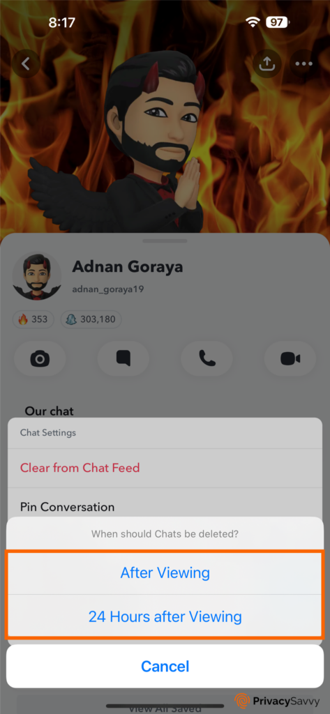 - 现在,轻敲在 ”删除聊天记录“ 和选择之间“观看后“ 和 ”观看后24小时”。