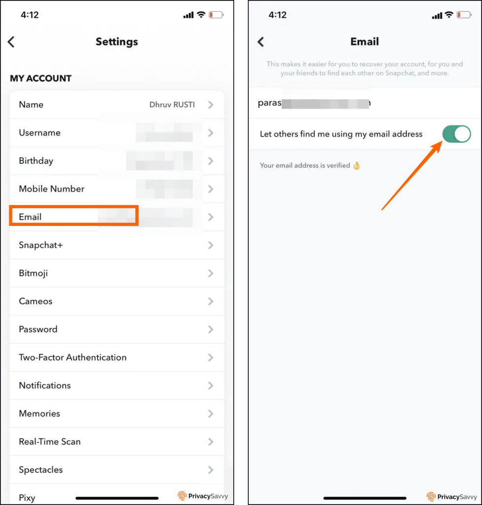 - 回去到设置页面。轻敲在 ”电子邮件”还有取消选中该框上面写着“让其他人使用我的电子邮件地址找到我”。