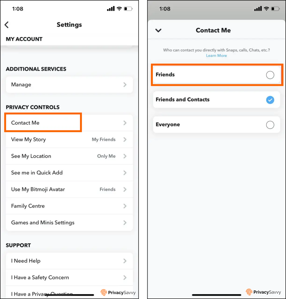 - 更改隐私设置从 ”朋友和联系人“ 或者 ”每个人“ 到 ”朋友们”。这样,只有您选择为朋友的人才能与您互动或向您发送快照。