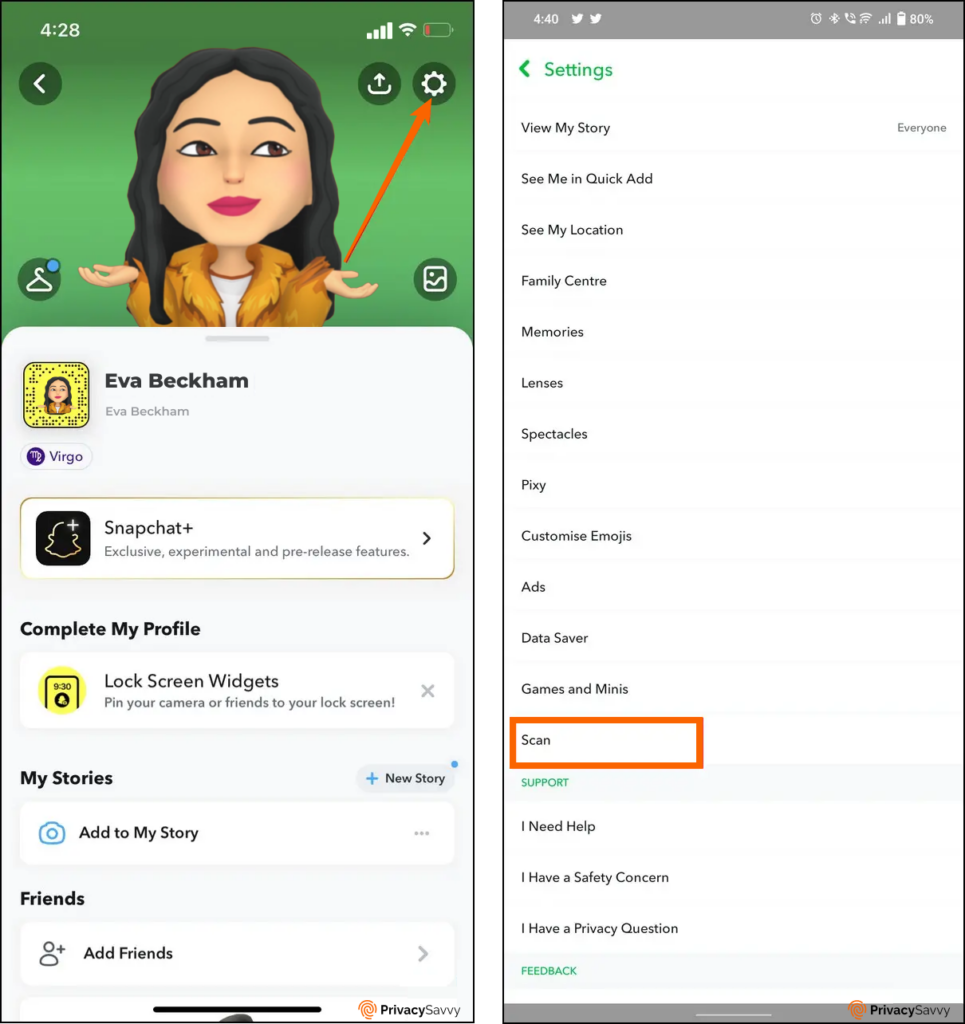 - 前往 设置在应用程序上找到“扫描” 在“隐私控制“ 部分。