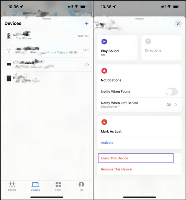 在其他设备上使用“查找我的”应用程序也是绕过被所有者锁定的 iPhone/iPad 的解决方案。确保“查找”已启用并输入您的 Apple ID 密码。 iPhone/iPad 被前任所有者锁定的问题可以通过将设备与您的帐户断开连接来解决。