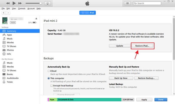 步骤2:接下来,将您的 iPad 与 iTunes 同步。位于 iTunes 屏幕的左上方。装置选择一个图标。在那之后概述在左侧边栏