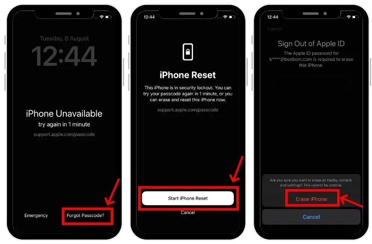 - 在下一个屏幕上,擦除该设备当屏幕上出现提示时,输入您的 Apple ID 密码。擦除过程完成后,请按照屏幕上的指南设置您的手机。
