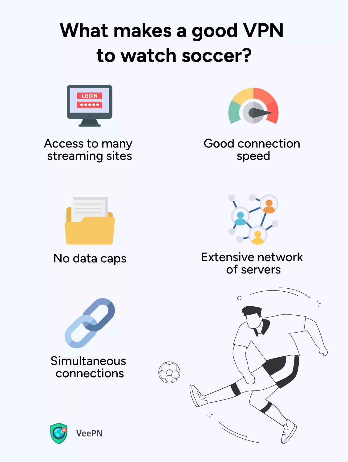 正在寻找值得信赖、功能强大且经济实惠的解决方案来直播足球比赛?看看 VeePN!这是一项信誉良好的 VPN 服务,拥有覆盖全球 60 个国家/地区 89 个地点的广泛服务器网络。 VeePN 不会损害您的互联网连接,并有效克服互联网限制,因此您的速度甚至可能在游戏期间提高。