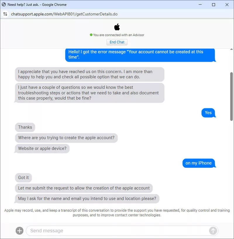 4。聊天窗口将自动打开,显示您已连接到顾问,然后您可以发送消息说明您正在遇到“当时无法创建Apple ID”问题。