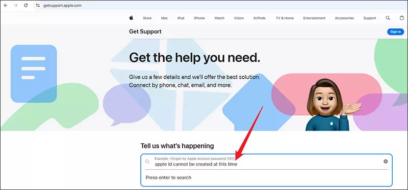 1。打开https://getsupport.apple.com/页面,然后在输入框中输入问题,例如“目前无法创建Apple ID”,然后按Enter。