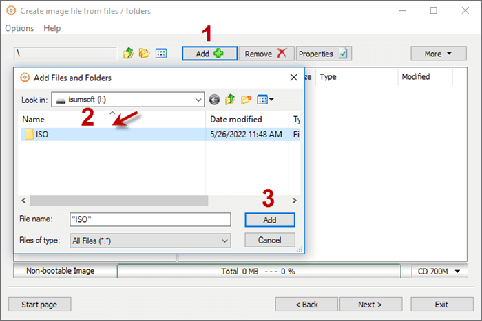 第 2 步:选择添加选项,然后选择包含可启动 USB 中所有文件的文件夹。然后点击添加在“文件名”字段旁边。