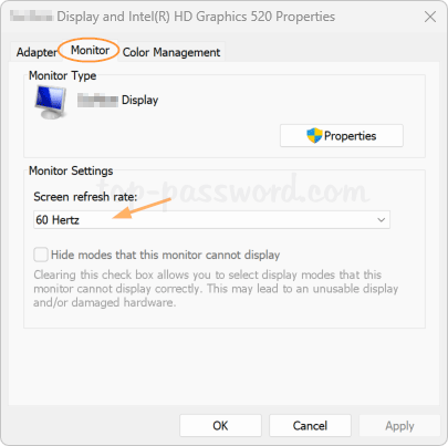 - 前往监视器选项卡,您可以单击“屏幕刷新率”下拉列表以选择您所需的刷新率设置。