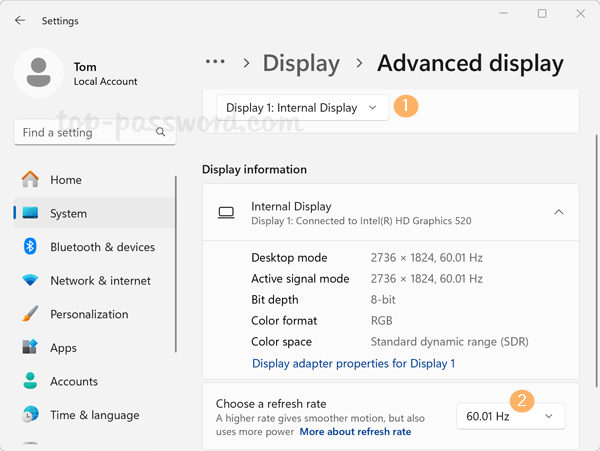- 在显示信息下,单击“选择刷新率”下拉菜单并选择您想要的刷新率。当您的电脑连接了多台显示器时,您需要单击顶部的下拉菜单来选择要更改刷新率的显示器。