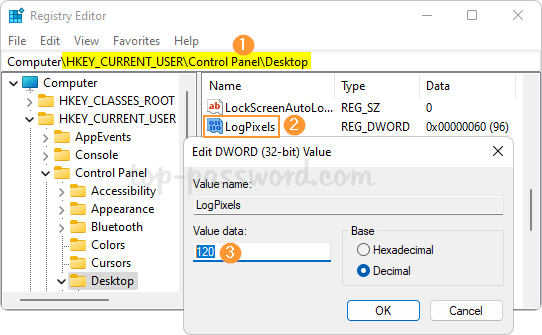 - 接下来,双击 DWORD对数像素编辑其值数据。输入 DPI 值(在十进制)从 96 到 480 之间选择。