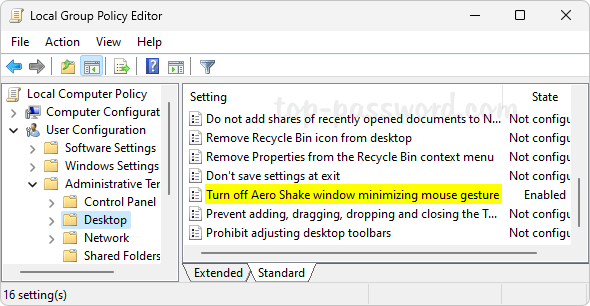 如果您启用了“标题栏窗口抖动”功能但仍然不起作用,则可能是组策略“关闭 Aero Shake 窗口以最小化鼠标手势”被激活。只需按照以下步骤禁用组策略: