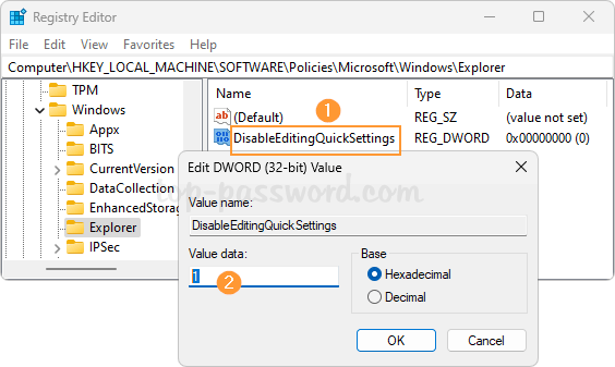 - 将 DWORD 值命名为禁用编辑快速设置。接下来,双击它,将其值设置为 1。单击好的。