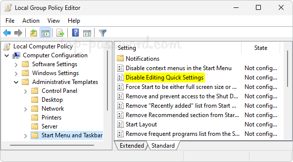 Computer Configuration -> Administrative Templates -> Start Menu and Taskbar。在右侧窗格中,找到“禁用编辑快速设置”策略,双击进行修改。