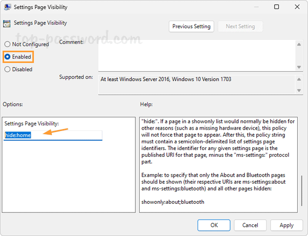 - 选择启用。在选项部分下,输入隐藏:家在“设置页面可见性”旁边的文本框中。点击申请进而好的。