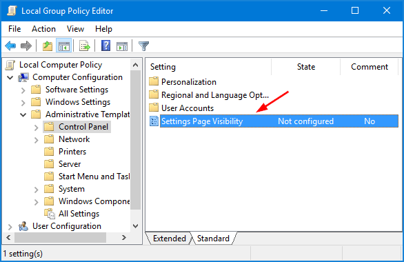 Computer Configuration > Administrative Templates > Control Panel,然后双击名为“设置页面可见性”在右窗格中。