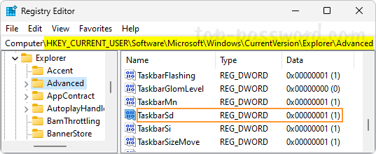 HKEY_CURRENT_USER\Software\Microsoft\Windows\CurrentVersion\Explorer\Advanced。双击dword任务栏在右窗格上。