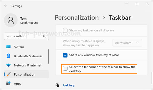 - 只是取消选中选择任务栏的最远角以显示桌面”选项,它将立即关闭显示桌面按钮。