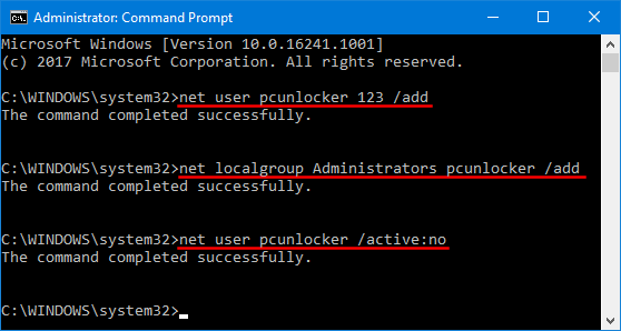 - 将以下代码复制并粘贴到命令提示符中。将 123 替换为您自己的密码,将 pcunlocker 替换为您的管理员名称。