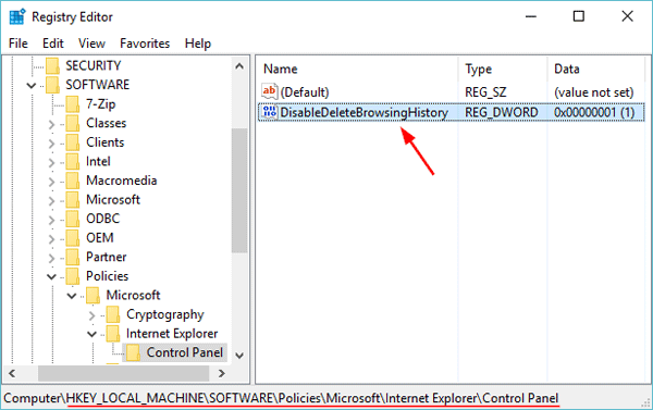 HKEY_LOCAL_MACHINE\Software\Policies\Microsoft\Internet Explorer\Control Panel如果两者都互联网浏览器键和控制面板key 不存在,您需要先创建它们。