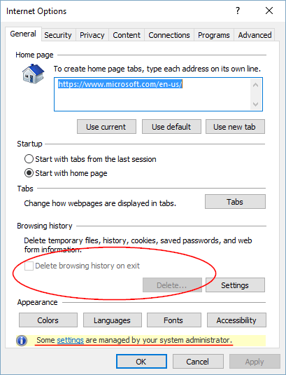 - 重新启动计算机。当您打开Internet Explorer的Internet选项时,您会发现删除浏览历史记录的按钮呈灰色。