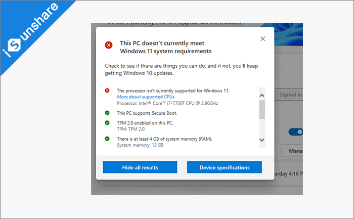 如果您的电脑不满足要求,您将看到“此电脑当前不满足 Windows 11 系统要求”弹出窗口。您可以单击“查看所有结果”按钮来查看更多详细信息。