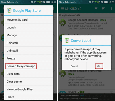有时,当您在 Link2SD 中单击用户应用程序时,可能找不到“转换为系统应用程序”选项。发生这种情况可能是因为该应用程序无法安装为系统应用程序。所以不用担心是你的安卓手机问题。当这种情况真的发生时,我认为你应该放弃转换为系统应用程序。