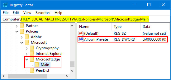如果您想再次打开 Microsoft Edge InPrivate 浏览,只需按照上述相同说明操作即可。但是,改变的值允许私密从0到1。