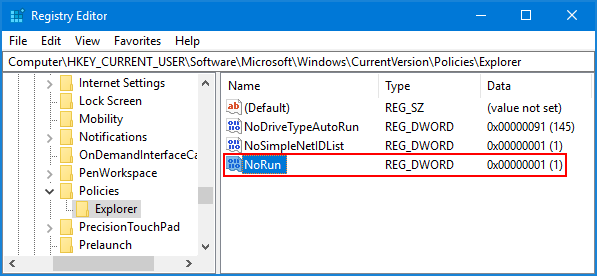 HKEY_CURRENT_USER\SOFTWARE\Microsoft\Windows\CurrentVersion\Policies\Explorer如果探险家键不存在,右键单击政策键,然后选择“新建”->“键”并将其命名为“探险家”。