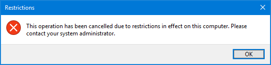 “由于该计算机上的限制,此操作已被取消。请与您的系统管理员联系。”