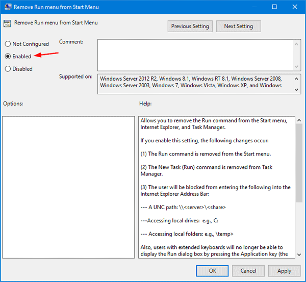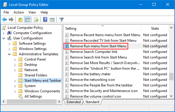 进入本地组策略编辑器后,只需设置“从开始菜单中删除运行菜单”政策至“未配置另一种方法是转到注册表项 HKEY_CURRENT_USER\SOFTWARE\Microsoft\Windows\CurrentVersion\Policies\Explorer 并更改 DWORD不跑到 0。就是这样!