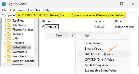 HKEY_CURRENT_USER\Software\Microsoft\Windows\CurrentVersion\VideoSettings。在右侧窗格中,右键单击空白区域并选择新的->DWORD(32 位)值。