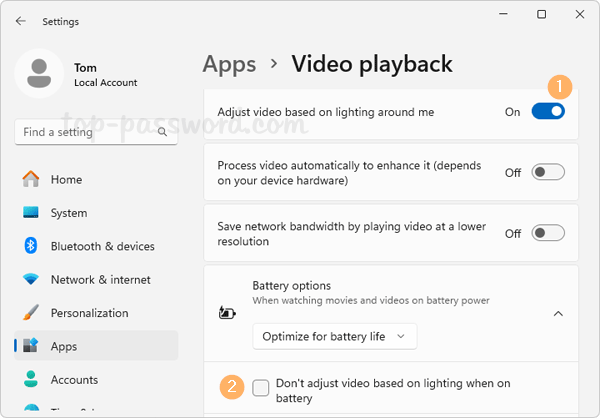 - 如果您可以看到名为“根据我周围的灯光调整视频“,您很可能有一个光传感器。您可以打开此设置以仅在视频播放时启用自动亮度调节。