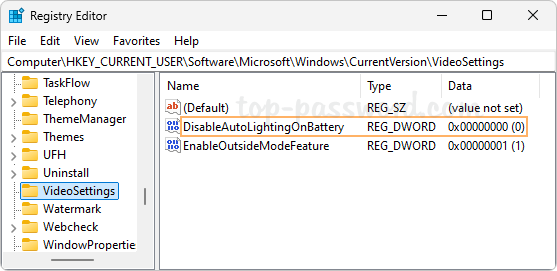 - 接下来,创建另一个 DWORD禁用电池自动照明并将其值保留为 0。这将关闭“使用电池时不要根据照明调整视频”选项。