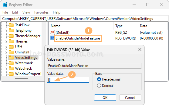 - 将新创建的名称命名为 DWORD启用外部模式功能,然后双击它并将其值数据设置为 1。这将打开 Windows 11 中的“根据我周围的照明调整视频”功能。