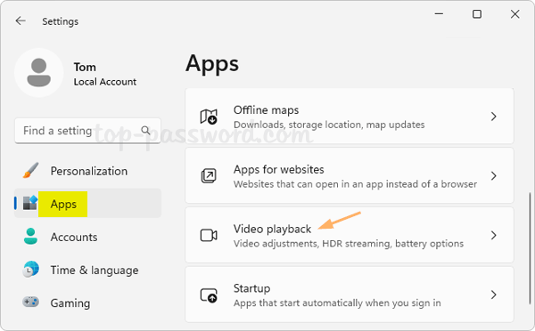 - 打开设置应用程序(Win+I)。选择应用程序左侧,然后单击视频播放在右侧窗格中。