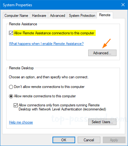 - 在“系统属性”窗口中,转到偏僻的选项卡并确保“允许远程协助连接到此计算机” 复选框已选中。接下来,单击先进的。