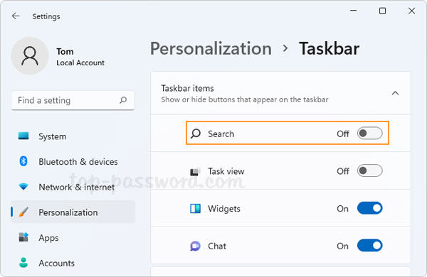 - 这将启动“设置”应用程序并带您进入页面:个性化 -> 任务栏。在右侧窗格中,切换搜索切换到离开。
