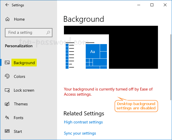 - 关闭桌面背景图像后,所有桌面背景设置都会被锁定,并且“设置”应用程序将显示一条警告消息“您的背景当前已被轻松访问设置关闭”。