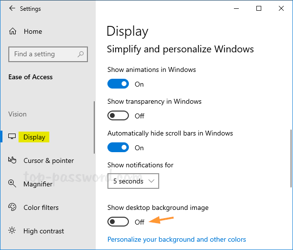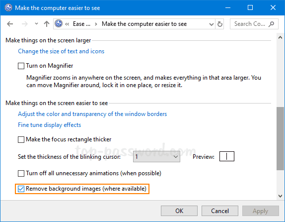 - 向下滚动到“使屏幕上的内容更易于查看”部分,选中“删除背景图像(如果有)”框并单击好的。您将获得黑色桌面背景。或者取消选中该框以使桌面背景图像再次显示。