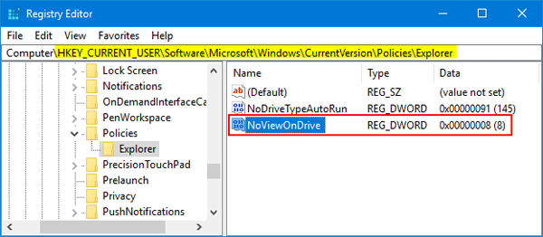 方法 2:使用注册表编辑器阻止在 Windows 10 中访问我的电脑中的驱动器