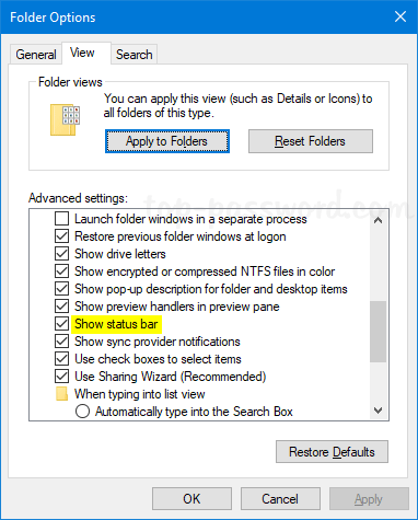 - 前往看法选项卡。在“高级设置”部分下,选中或取消选中“显示状态栏” 选项取决于您是否要启用状态栏。