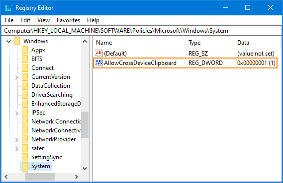 - 命名值允许跨设备剪贴板。双击它并将值设置为 1 以打开剪贴板同步功能。